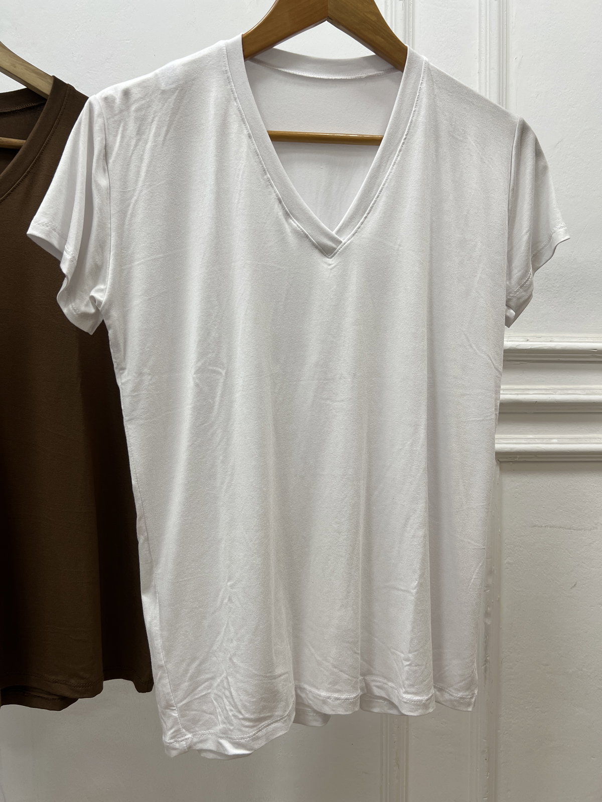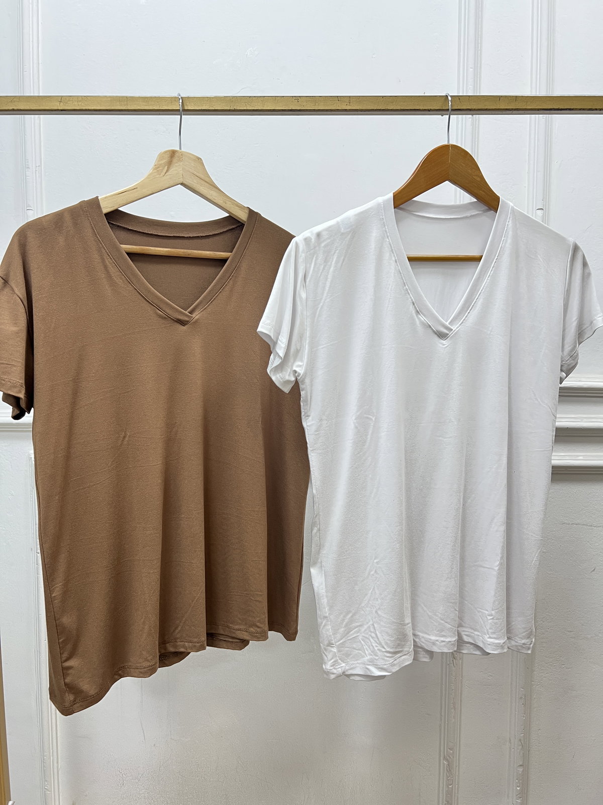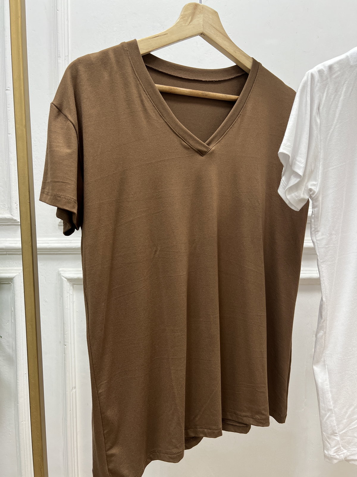 Confeccionada en tela modal súper suave y liviana, se destaca por su caída fluida que se adapta al cuerpo brindando máxima comodidad durante todo el día. Su diseño de escote en V aporta un toque femenino y favorecedor, ideal para estilizar la silueta. De manga corta y calce relajado, es perfecta para usar sola o como base para armar distintos looks.