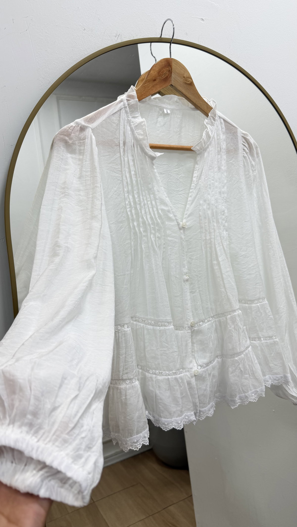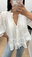 Su diseño se destaca por el escote en V con botones frontales y detalles de alforzas que estilizan la silueta. El cuello con leve volado y las mangas largas con puño elastizado suman un aire elegante y relajado. En la parte inferior, los recortes con volados y terminaciones en puntilla le dan un toque artesanal y súper femenino.