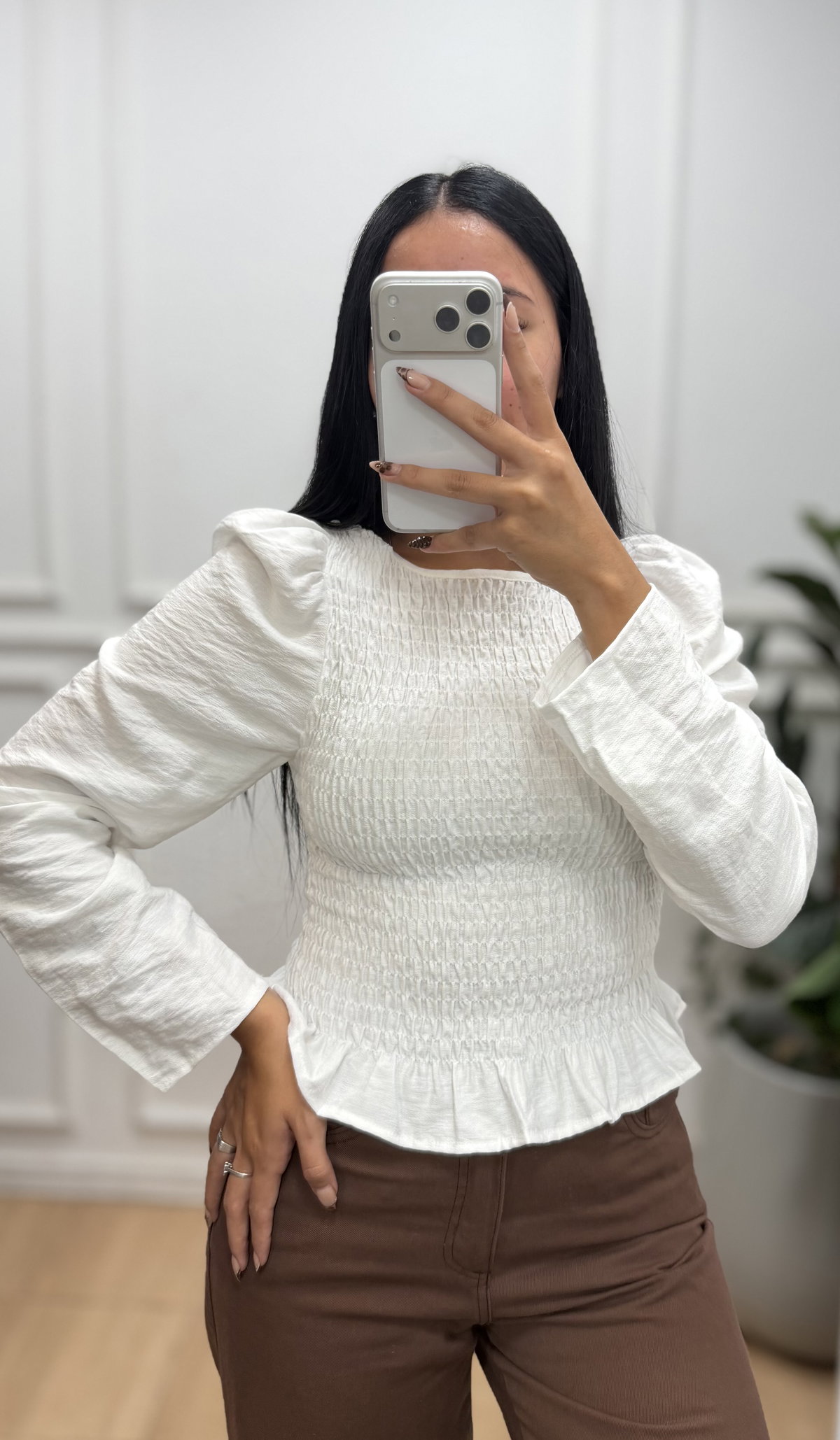 Blusa con frunce tipo panal, una prenda delicada y súper femenina que realza la silueta. Confeccionada en tela liviana y texturada, presenta un cuerpo elastizado que se adapta cómodamente al busto, mientras que sus mangas largas con leve volumen aportan un toque romántico.