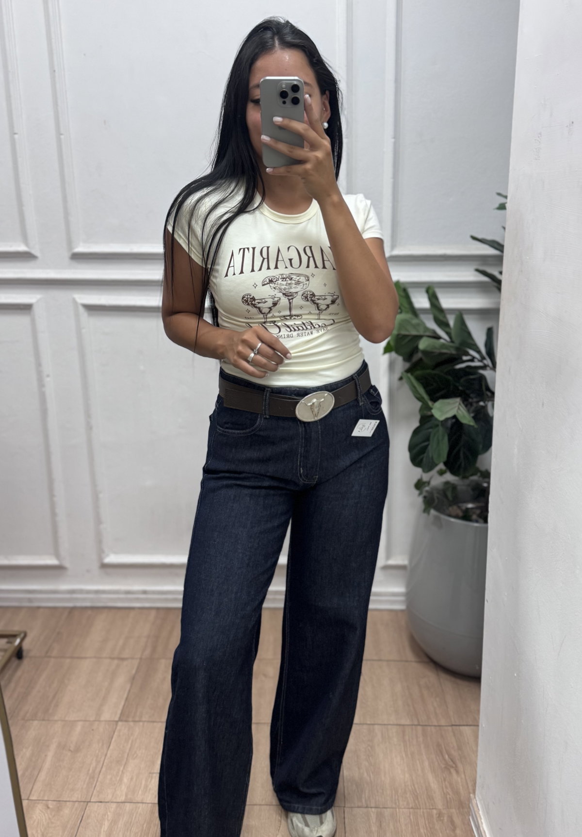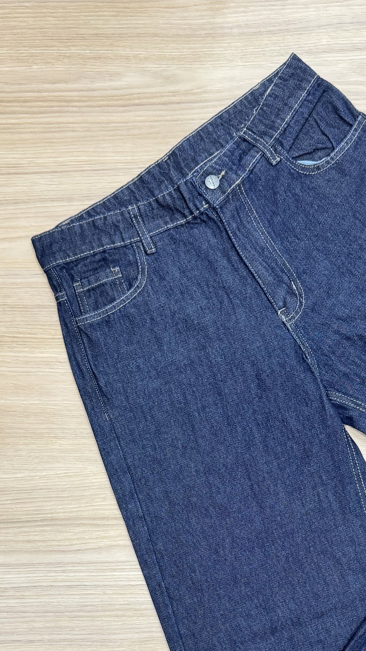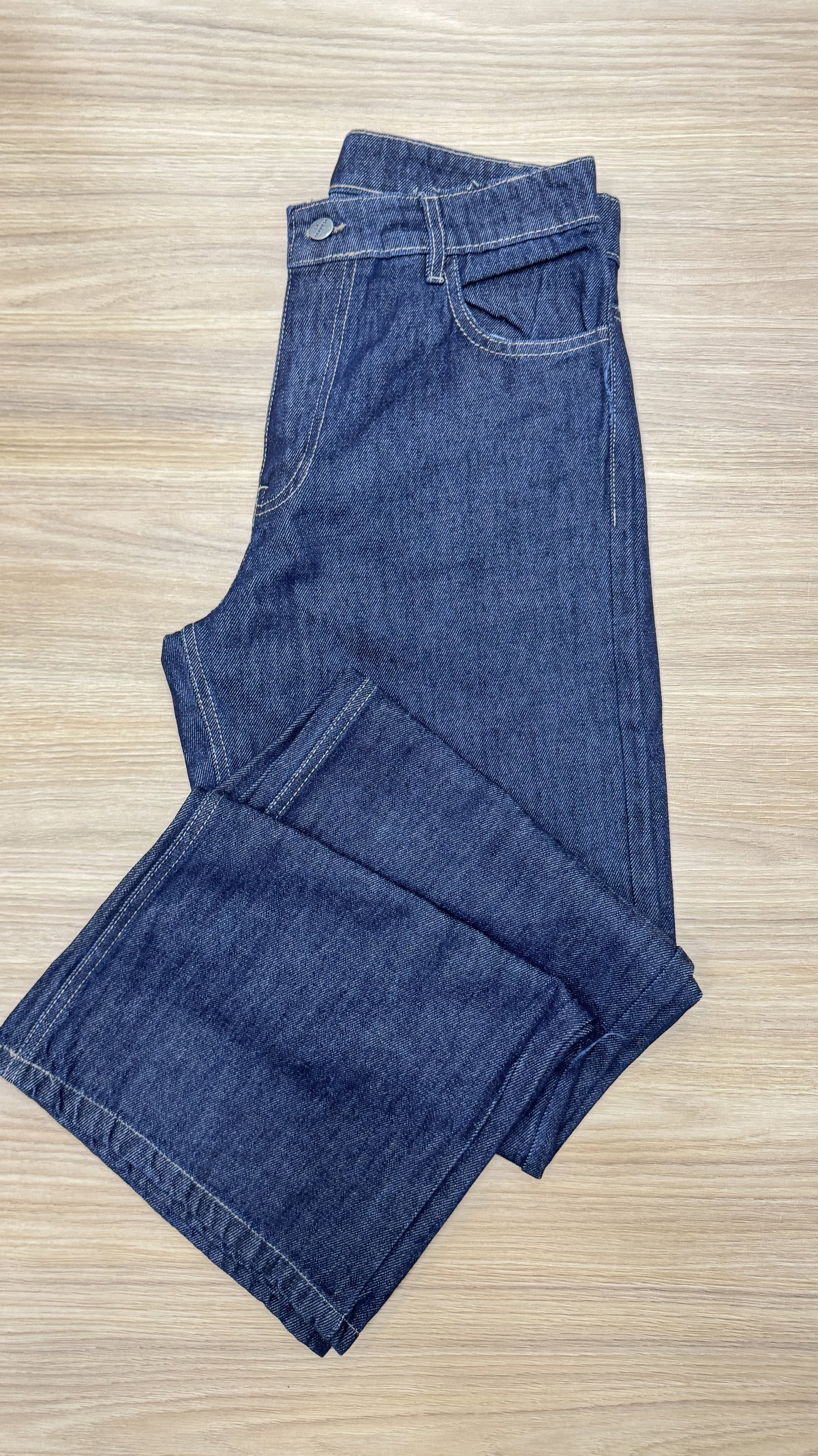 Jean de denim azul oscuro de tiro medio/alto y pierna ancha. Su diseño clásico con bolsillos delanteros y costuras en contraste lo convierte en una prenda cómoda y versátil. La botamanga amplia aporta un estilo moderno y relajado, ideal para combinar con distintos looks.